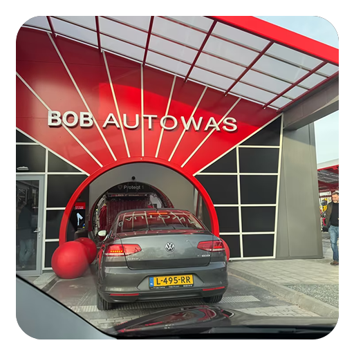 Nieuwe Bob wasstraat draait proef en staat iemand aan de weg met promo bord, helemaal gratis! BOB A...