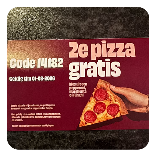 Eerste pizza is vrij van keuze, de gratis pizza: keuze uit margherita, peperoni of funghi. Code = 14...