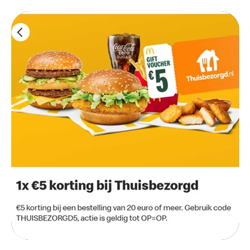 €5,- korting bij Thuisbezorgd als je voor 20€ besteld. Via de McDonalds app, weet niet of dit ook re...